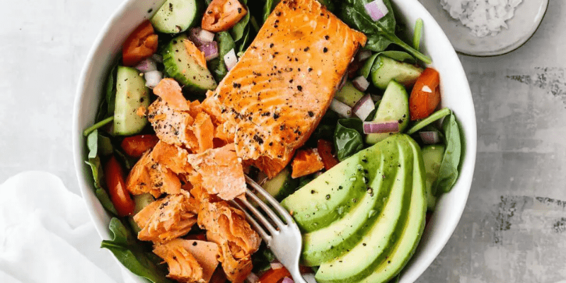 Trưa: Cá hồi áp chảo + rau cải thìa + cơm lứt