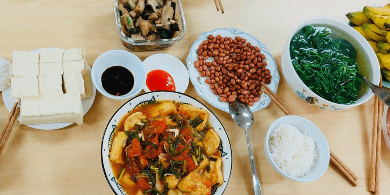 - Trưa: Đậu hũ hấp + cải ngọt luộc + cơm lứt